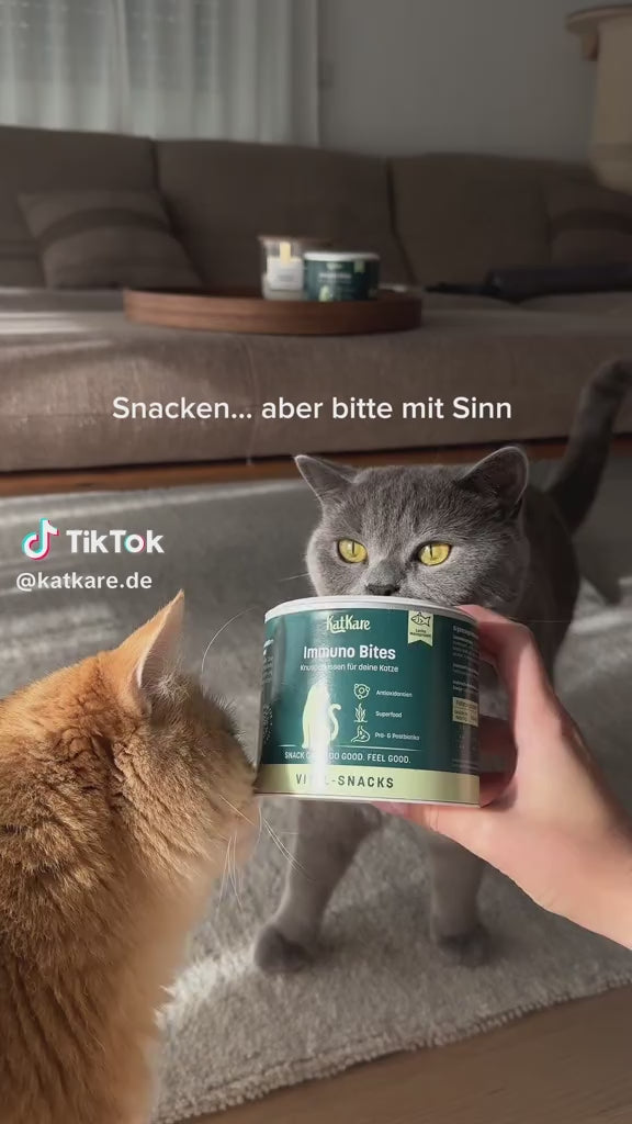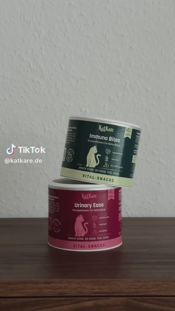 Unsere KatKare Vital Snacks sind die tägliche Portion Gesundheit fürKatzen jeden Alters. Die Vital Snacks idealerweise täglich füttern, um die gesundheitsfördernde Wirkung optimal zu unterstützen. Gönne deiner Katze dieses hochwertige Extra, wobei die empfohlene Tagesmenge nichtüberschritten werden sollte. Achte stets darauf, deiner Katze ausreichend sauberes Trinkwasser zur Verfügung zu stellen. Bewahre die Dose kühl, trocken und geschlossen auf, um den vollen Geschmack und die Qualität optimal zu bewahren.